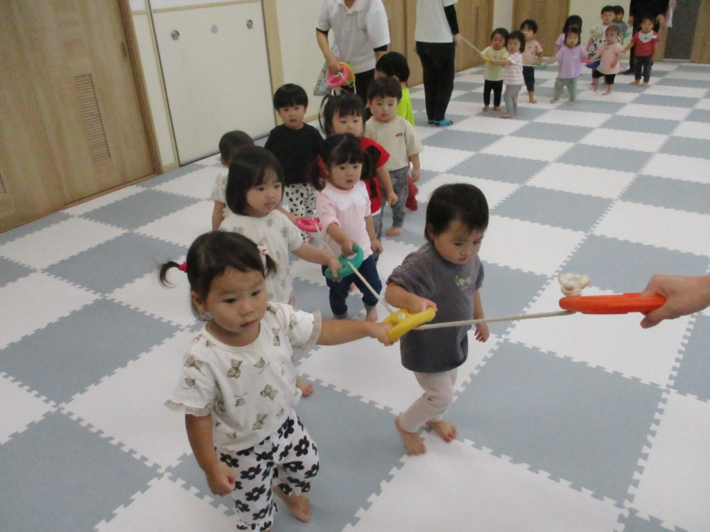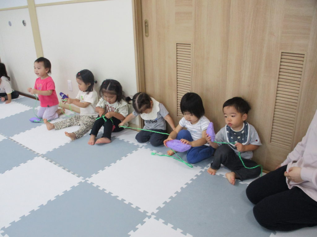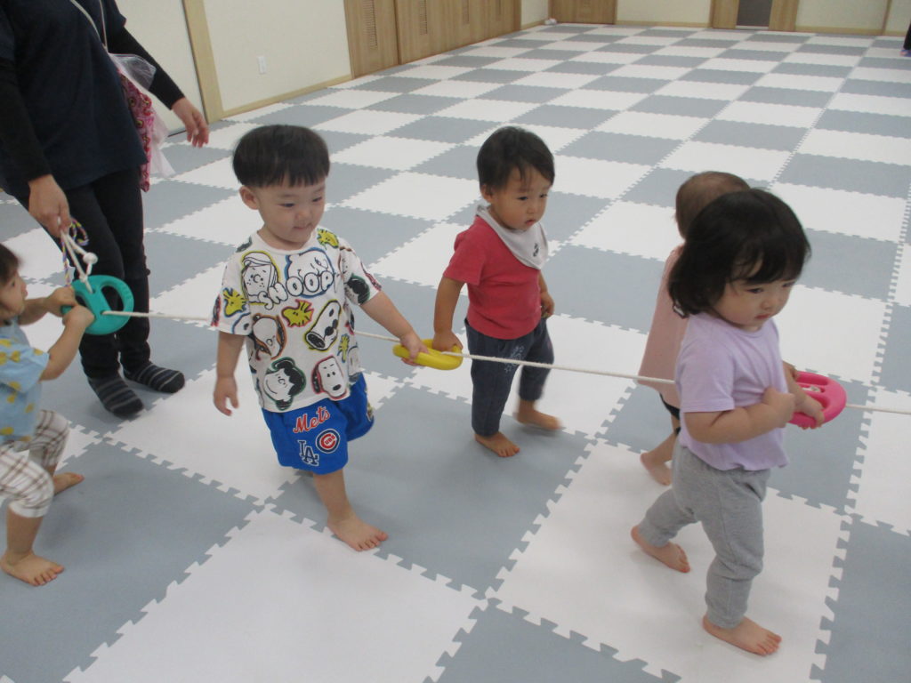 すみれぐみのおともだちはお散歩ロープを使って歩く練習とボールあそびをしました。