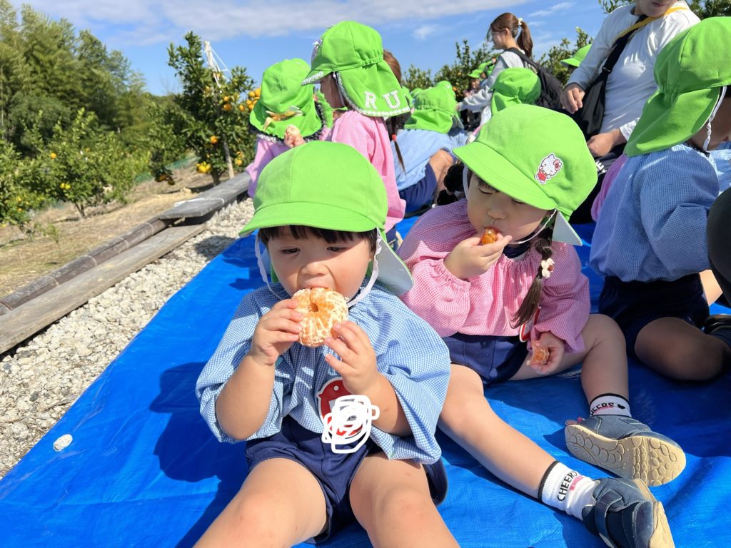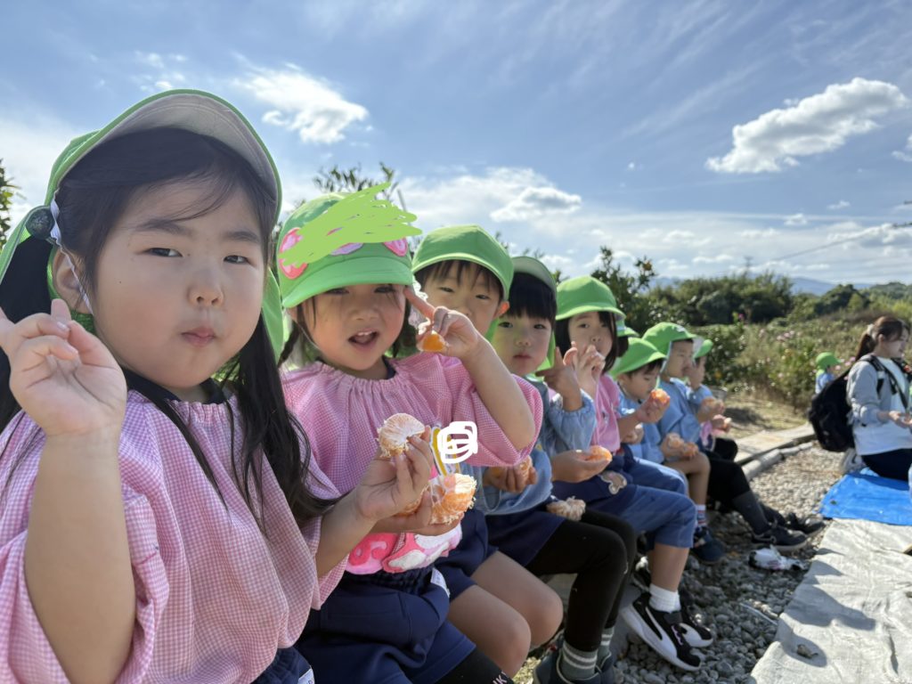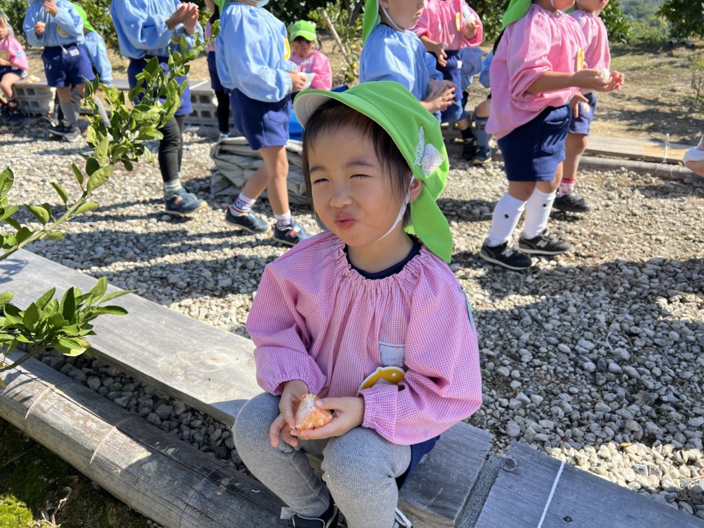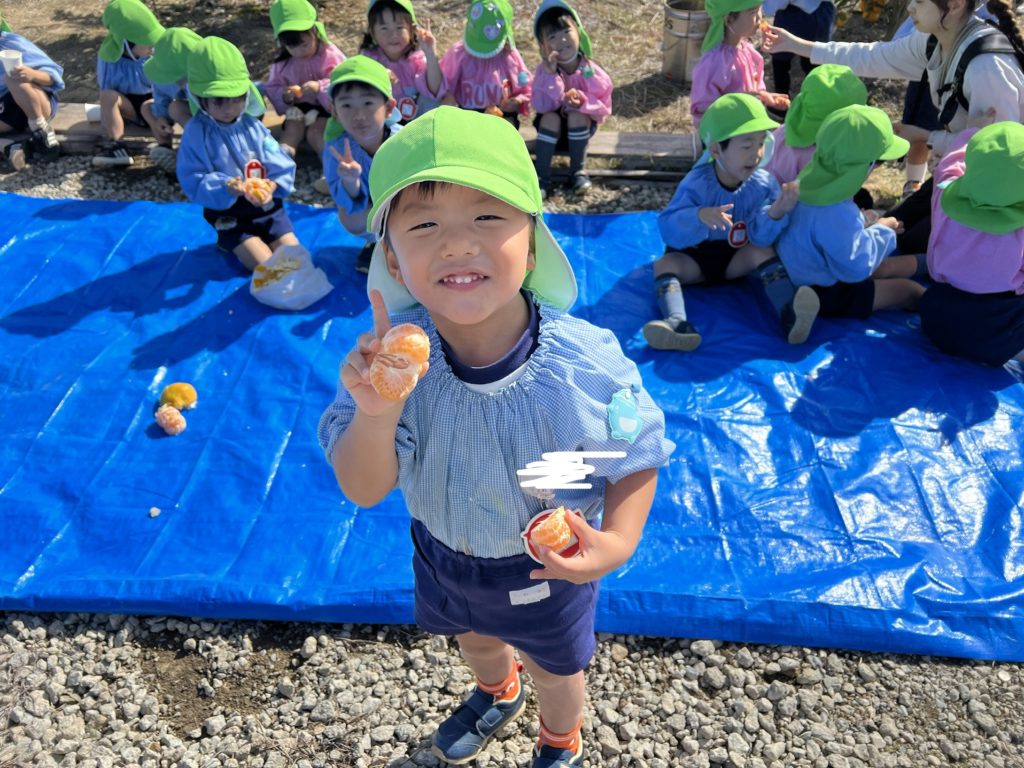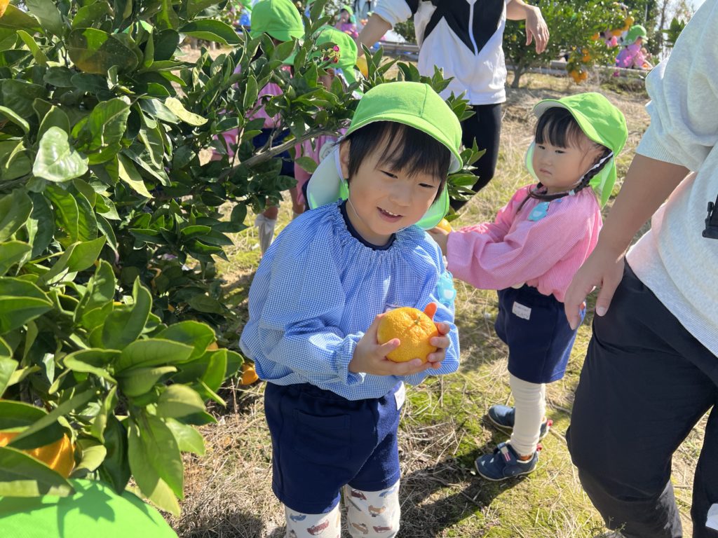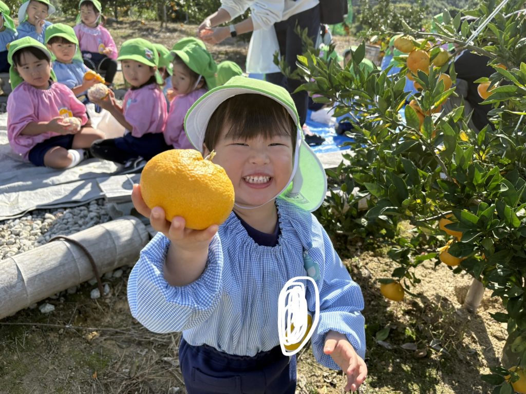 お友だちの手からはみ出すぐらい大きなみかんを持って