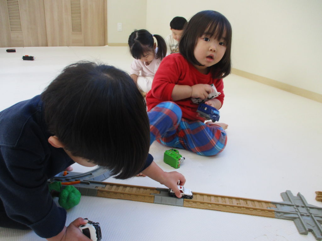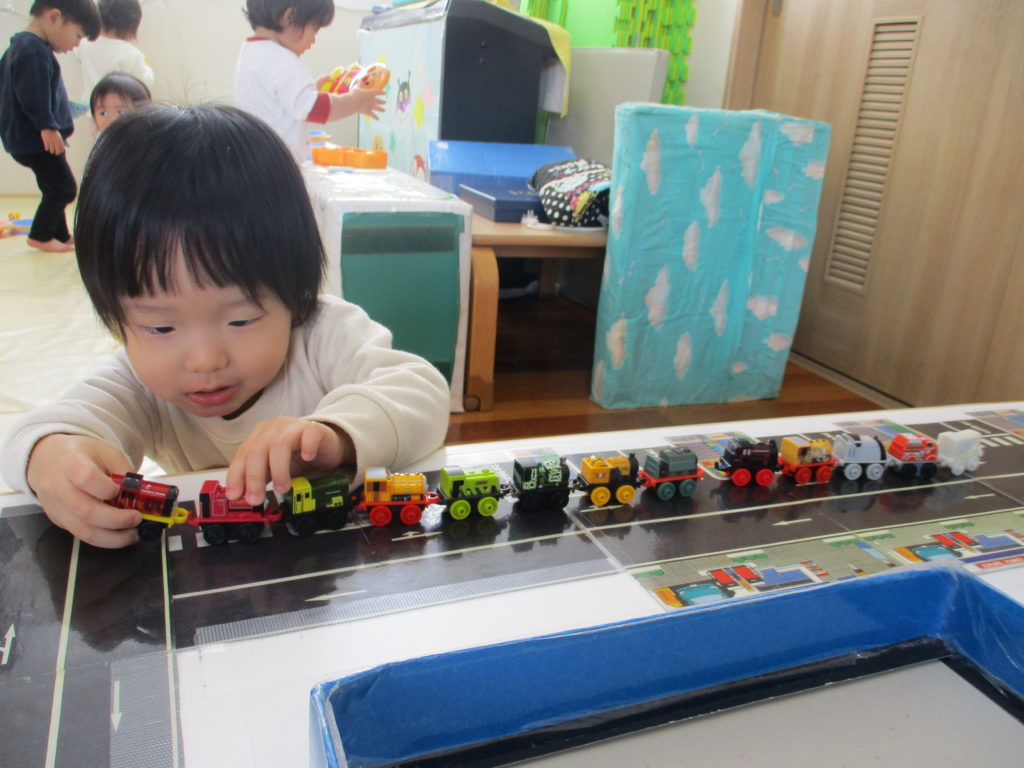 乗り物コーナーでは、「みて、ながいよ~!」とどこまで繋げられるかにチャレンジ!!