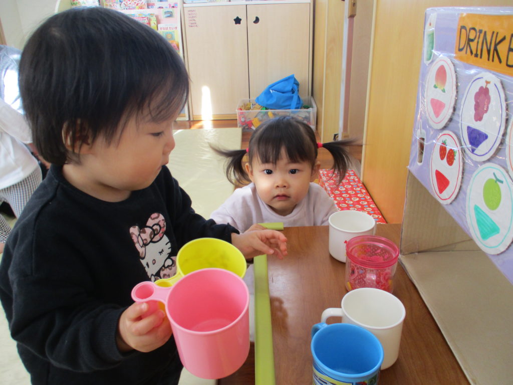 先生やおともだちから注文を受けてドリンクバーにジュースを入れるおともだち🍹