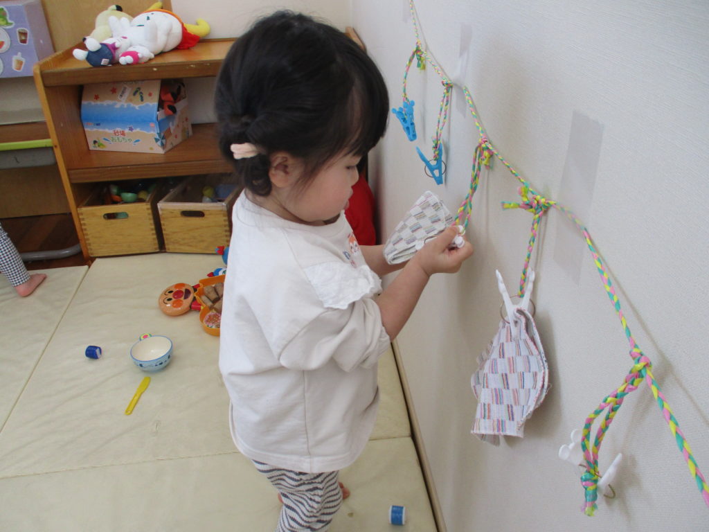壁には、洗濯干しスペースもあり、指先を上手く使いハンカチを挟んでいました✨