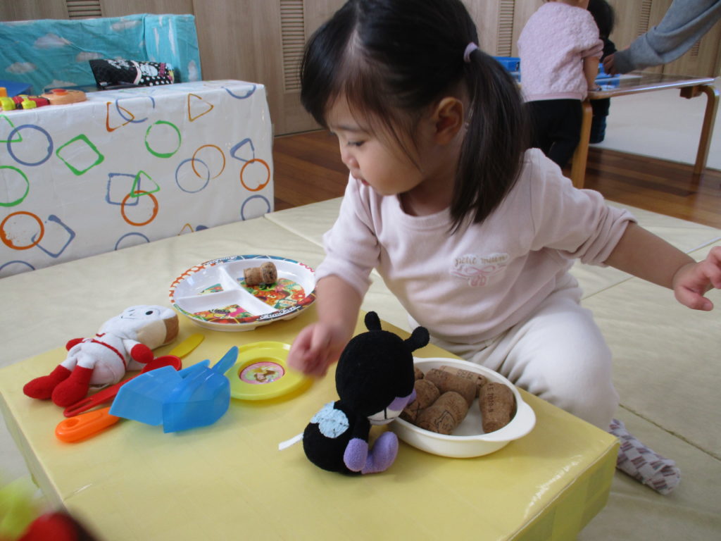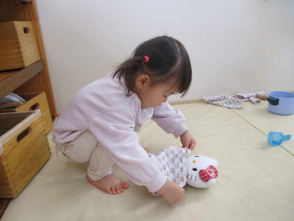 お人形にそっとハンカチを掛けてあげたり、食べさせてあげたり、