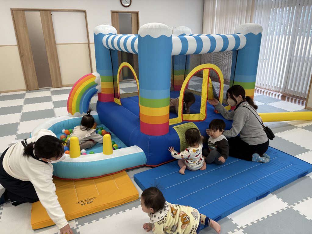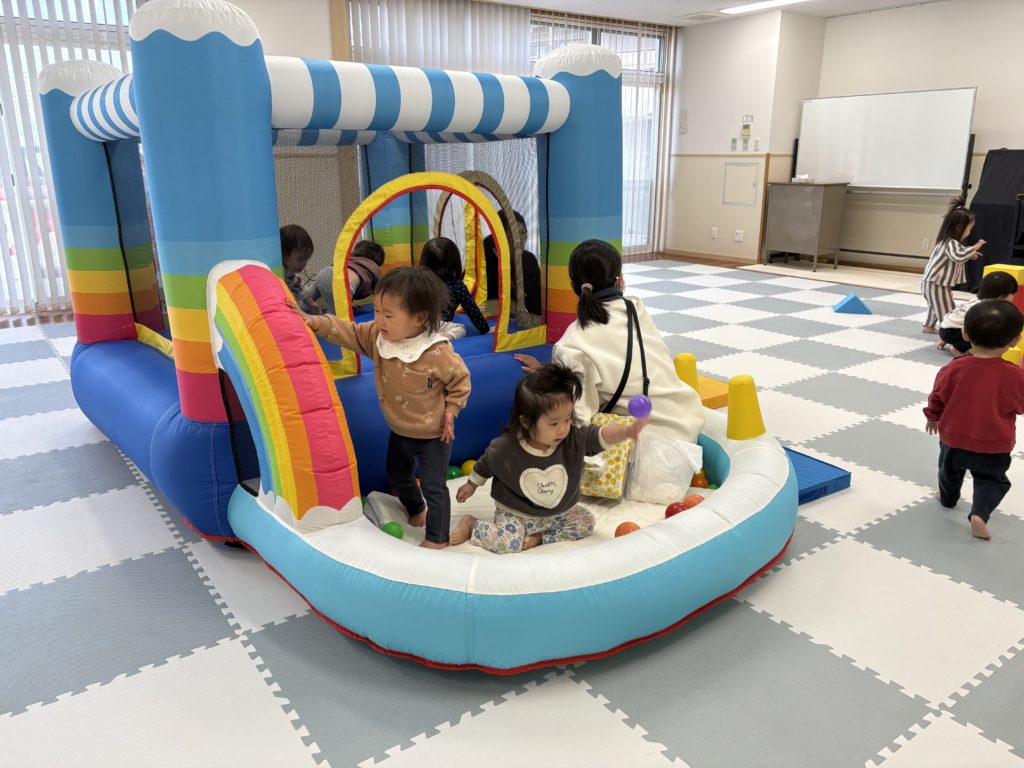 ふわふわ遊具に空気を入れる場面では「おぉー!」「あっ!」と指さしして