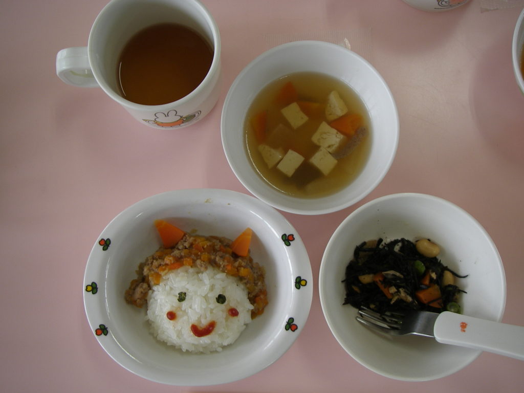 遊んだ後は鬼の形のそぼろごはんを「おいしいね」「かわいい」と