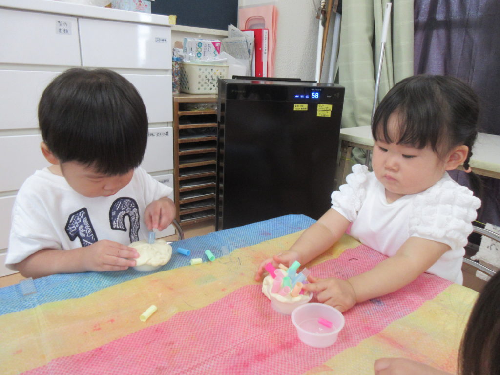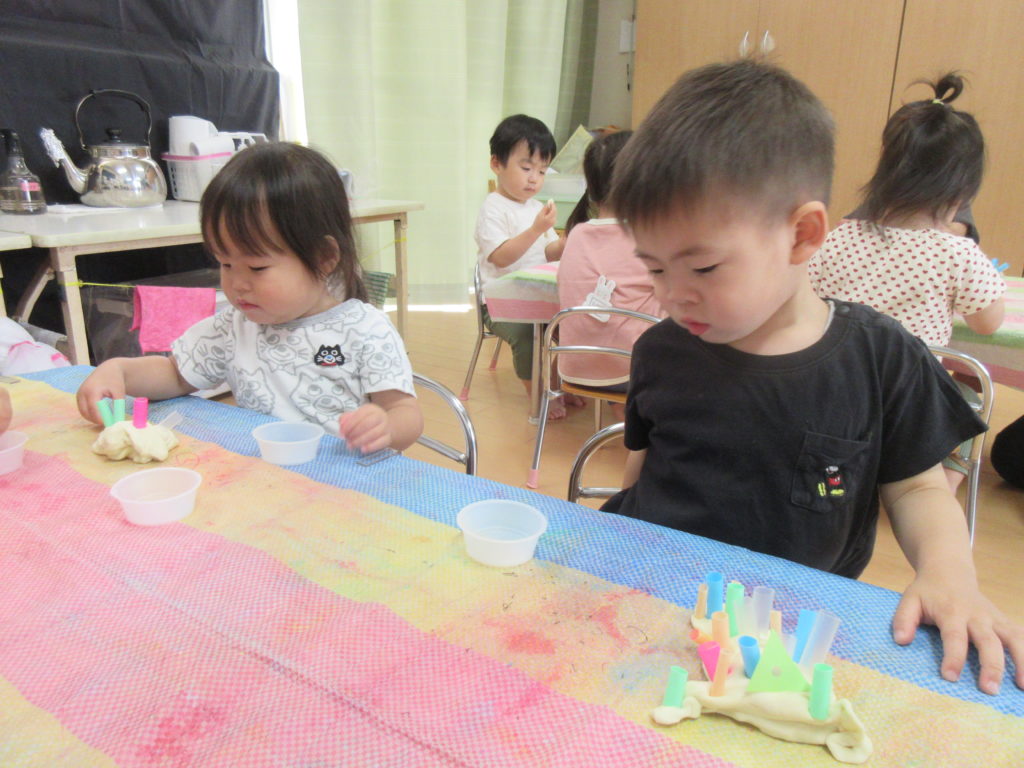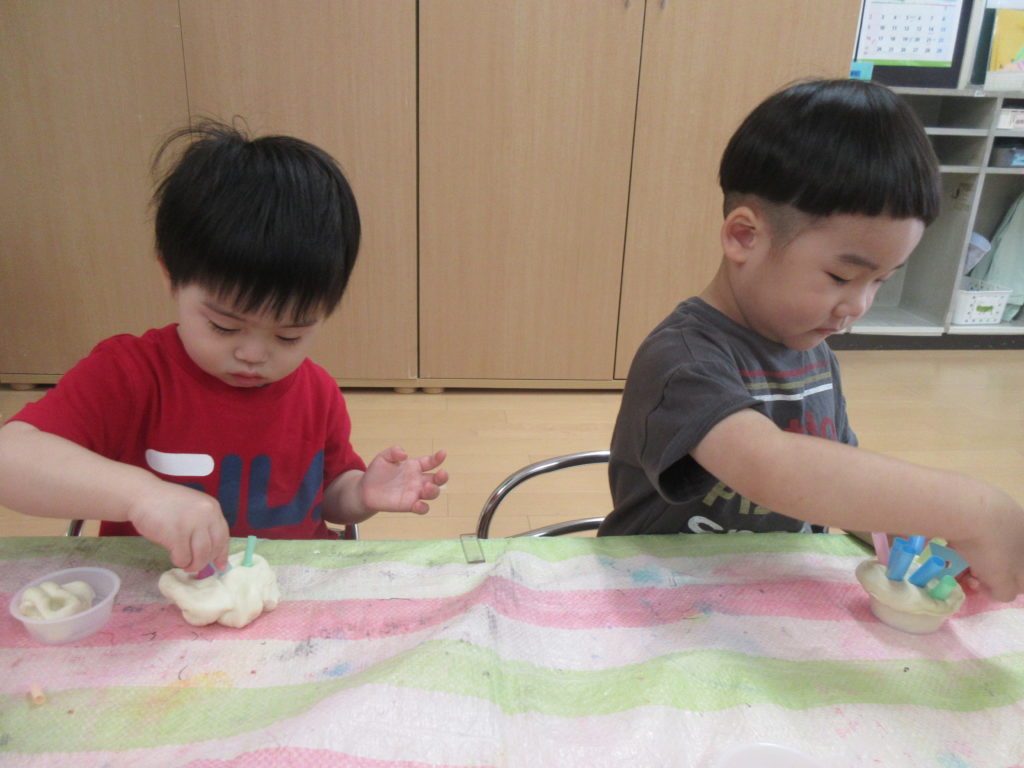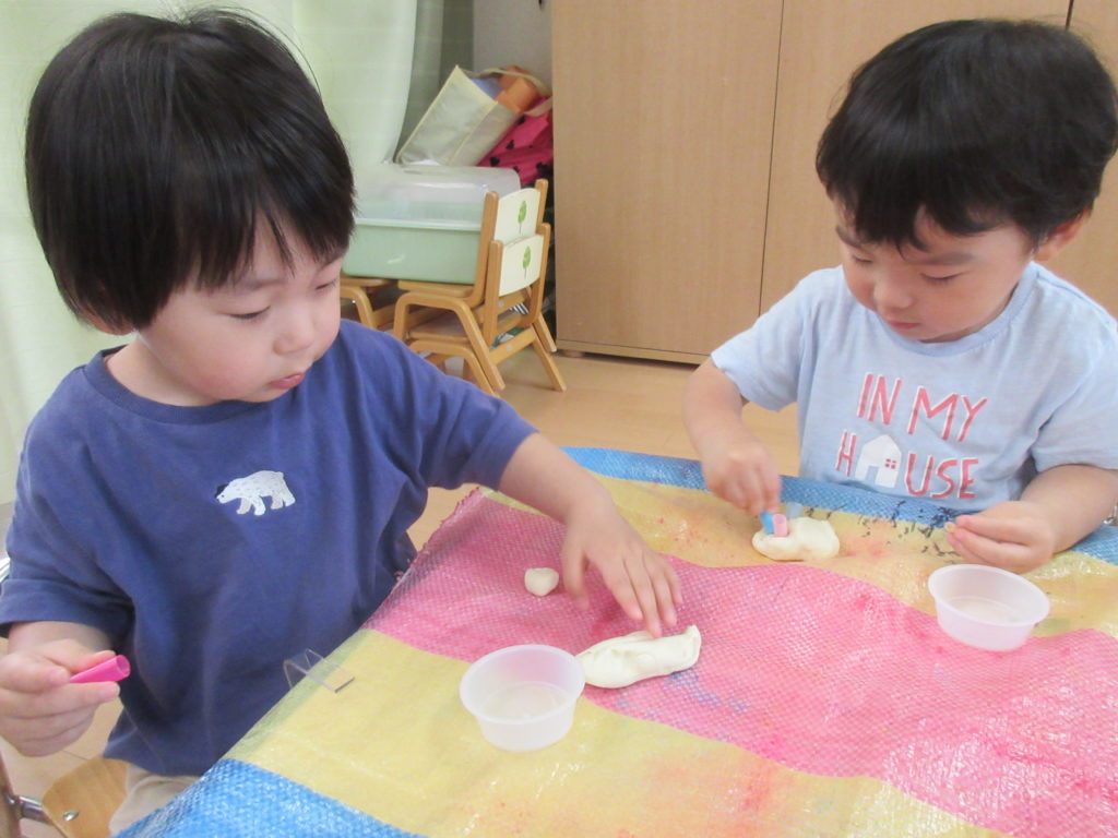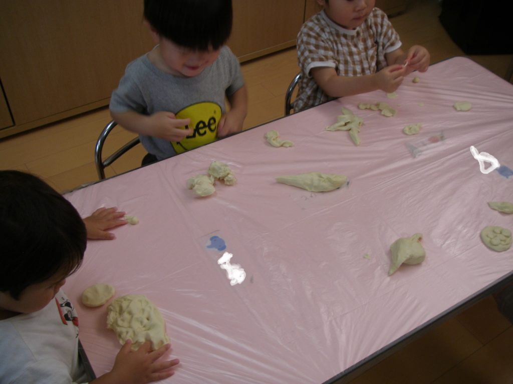 うさぎぐみとぞうぐみのおともだちは小麦粉粘土を楽しみました。