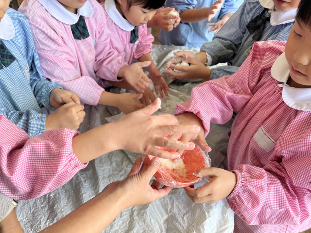 蒸しあがったもち米を触ってみました。「ごはんだ~!」と言っていましたよ。