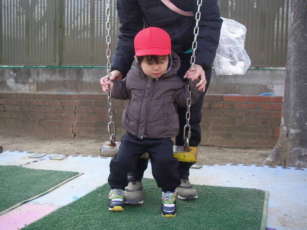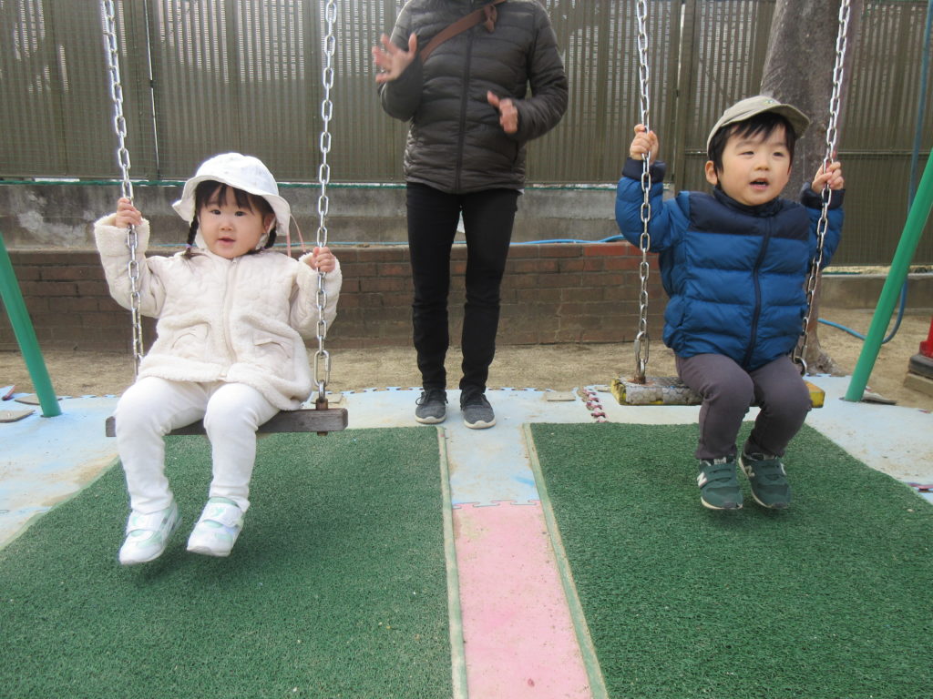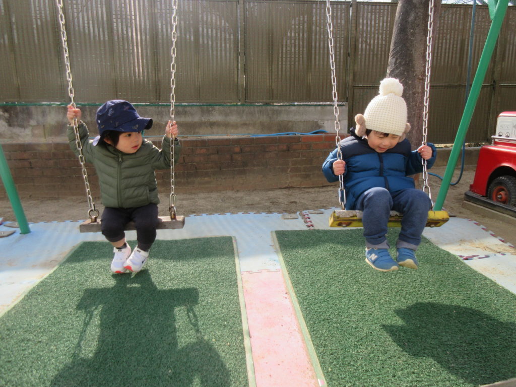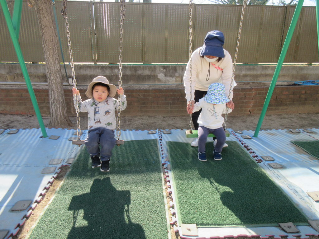 今月、2歳児クラスのお友だちは、園庭にあるブランコに挑戦しました!