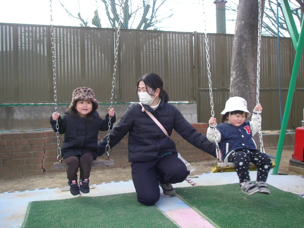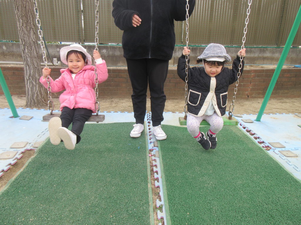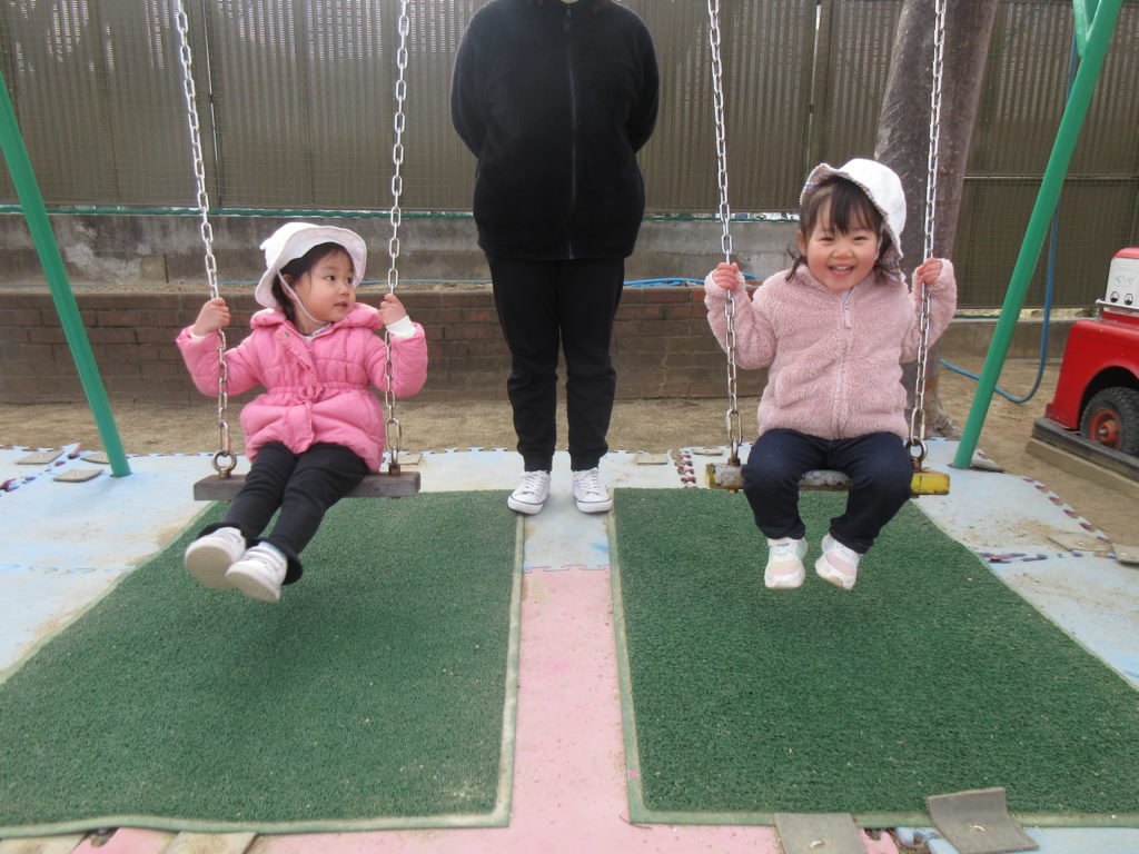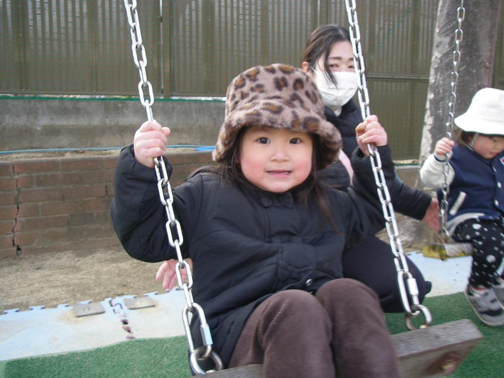 今月、2歳児クラスのお友だちは、園庭にあるブランコに挑戦しました!