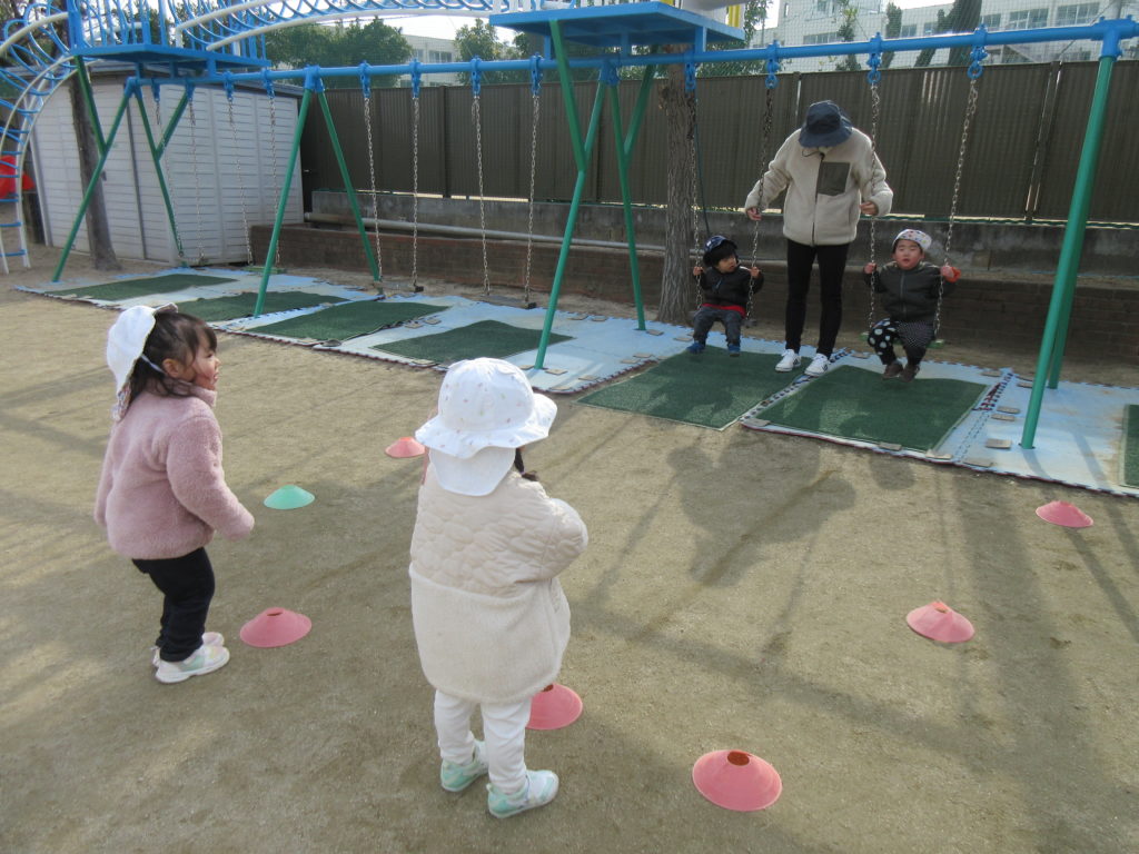 園庭のブランコは初めてで少し驚くお友だちもいましたが、