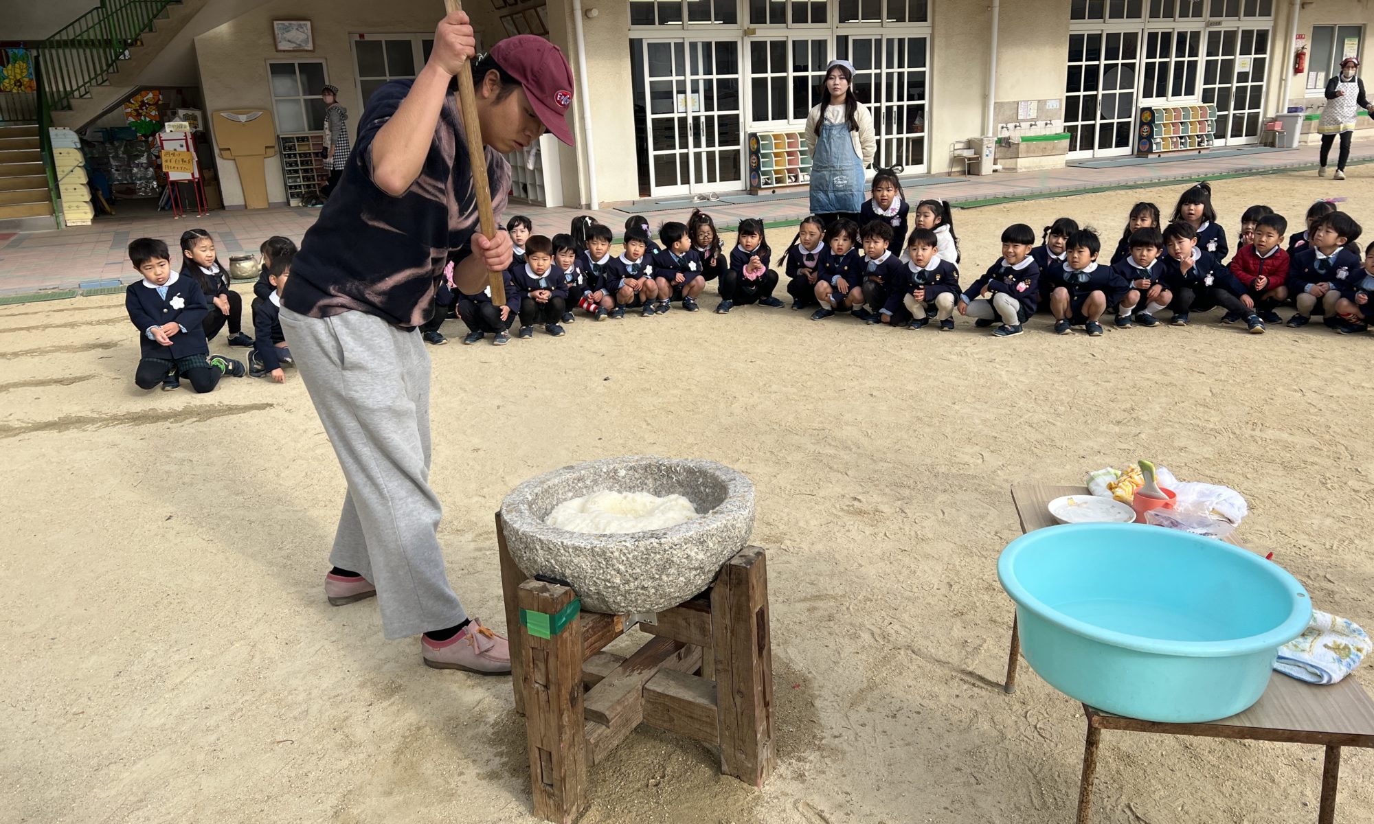 朝から園庭には薪を燃やすにおいがしていました。 登園した子どもは「なんかにおいがする~!」と興味津々。 朝早くから園長先生と男性職員がかまどに薪をくべて、火を起こしてくれていました。 このかまどでお湯を沸かし、餅米を蒸し …