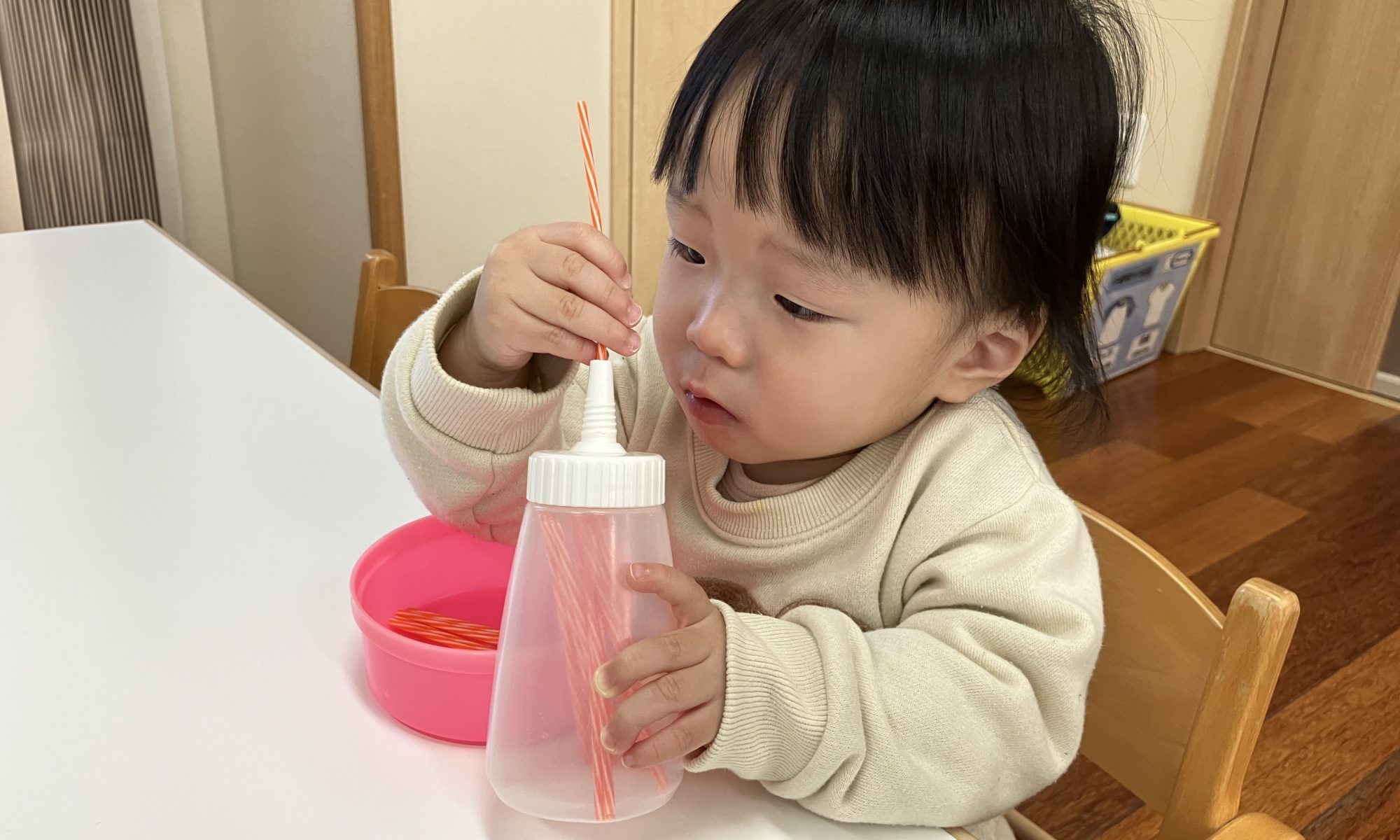ひよこぐみのおともだちは指先あそびをしました。 小さい穴をよーく見てひとつひとつ入れていきます!! こうしたら入るかな?? こっちの手はたくさん持って、こっちの手で入れていこう!! だるまさんお腹が空いたかな?? お口の …