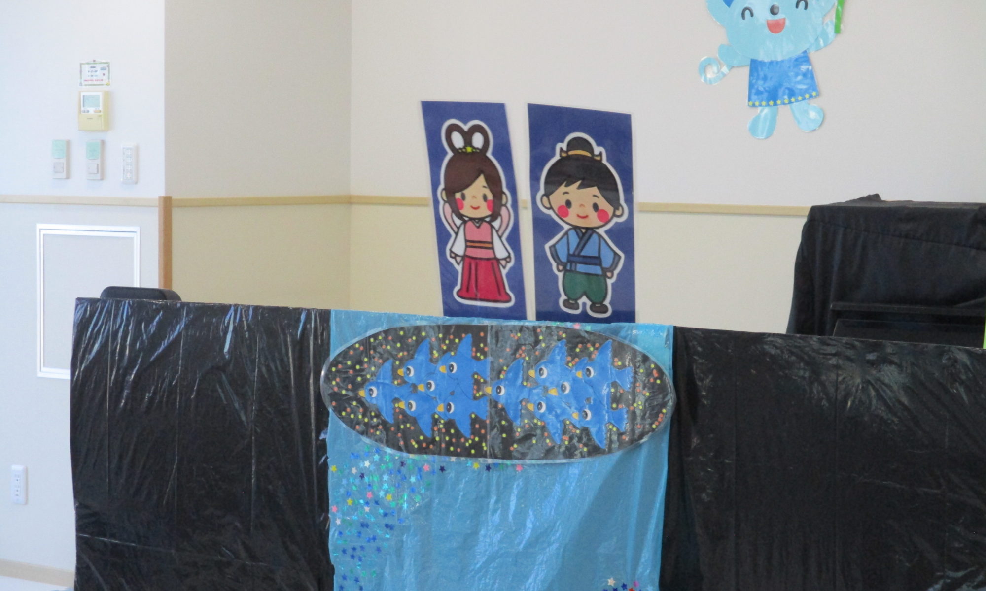 七夕会がありました。 全クラスのおともだちが集まった初めての行事です★ どんなことが始まるのか、 ドキドキ!ワクワク! ペープサートが始まると 真剣な表情で見ていました! 『おりひめさま と ひこぼしさまが・・・♪』 と …