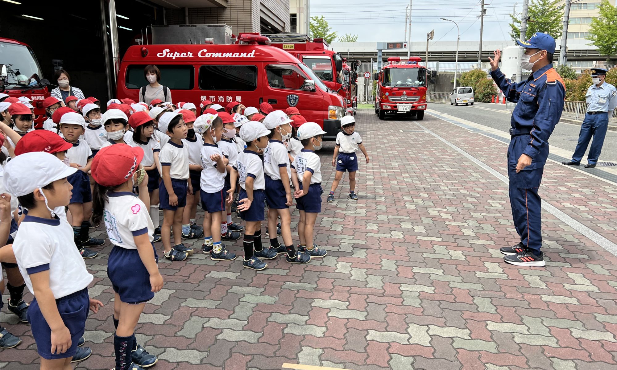 今日は待ちに待った消防署見学の日でした。 みんなで歩いて、中消防署まで行きましたよ。 3グループに分かれて、車両見学をさせて頂きました。 消防士さんの話に目を輝かせる子ども達、 「これは何?」「どうやって使うの?」 「ど …