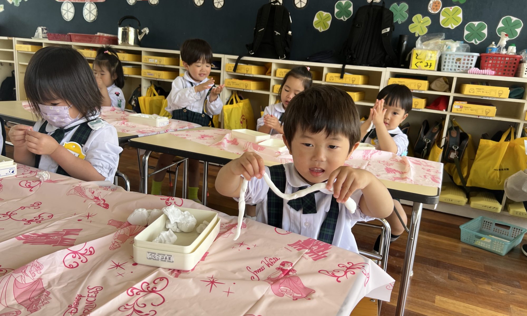 入園して1か月が経ち、園生活にも慣れて毎日笑顔で登園してくれています。 今日は粘土遊びの様子を撮ってみました! 真剣なお顔で何を作ろうか考え中! カメラがあるから少し緊張しているみたい(;^ω^) みんな夢中で作成中です …