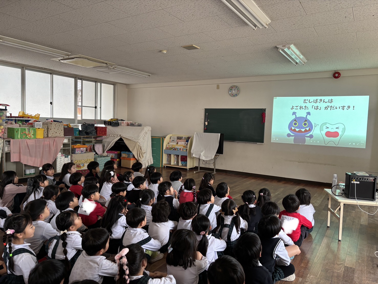 子どもたちに楽しみながらお口をケアする事の大切さを知ってほしいとの思いから モンダミンキッズイベントを園で実施しました(^^♪ まずはお口ケアの大切さを知るクイズをしましたよ。 出される問題にすぐに答えるおともだち!正解 …